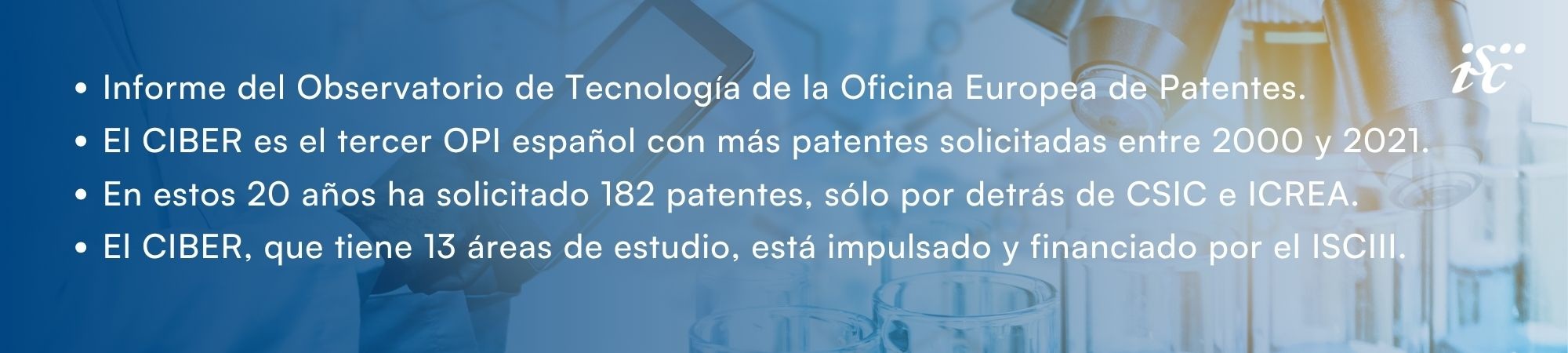 El Consorcio Centro de Investigación Biomédica en Red (CIBER), dependiente del Instituto de Salud Carlos III (ISCIII), está entre los tres organismos públicos de investigación (OPI) españoles con mayor número de solicitudes de patentes europeas, según el último estudio desarrollado al respecto por el Observatorio de Patentes y Tecnología de la Oficina Europea de Patentes (OEP). De esta manera, el CIBER se reafirma como uno de los principales motores de la innovación científica en España,