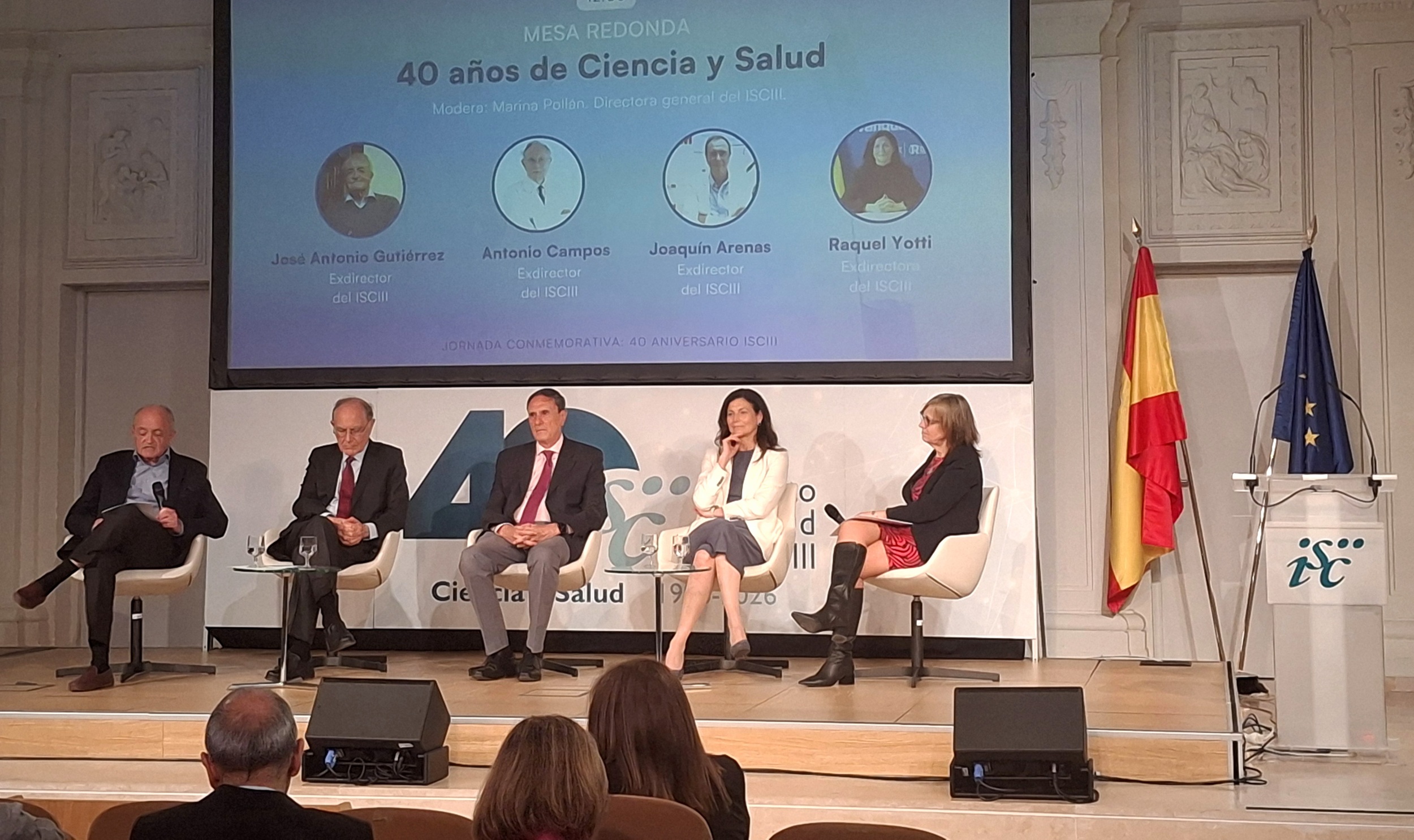 Tras la inauguración oficial, se ha celebrado una primera mesa redonda, moderada por nuestra directora, que ha contado con cuatro exdiectores del Instituto: José Antonio Gutiérrez Fuentes (1996-2000), Antonio Campos Muñoz (2000-2004), Joaquín Arenas Barbero (2012-2013) y Raquel Yotti Álvarez (2018-2021). En sus intervenciones, han recordado cómo surgieron y se consolidaron diversas iniciativas impulsadas desde el ISCIII, como la financiación de proyectos de investigación en salud y de contratos científicos, la generación de redes de investigación por todo el territorio nacional, el impulso al modelo CIBER y la relación con los Institutos de Investigación Sanitaria, entre muchos otros.