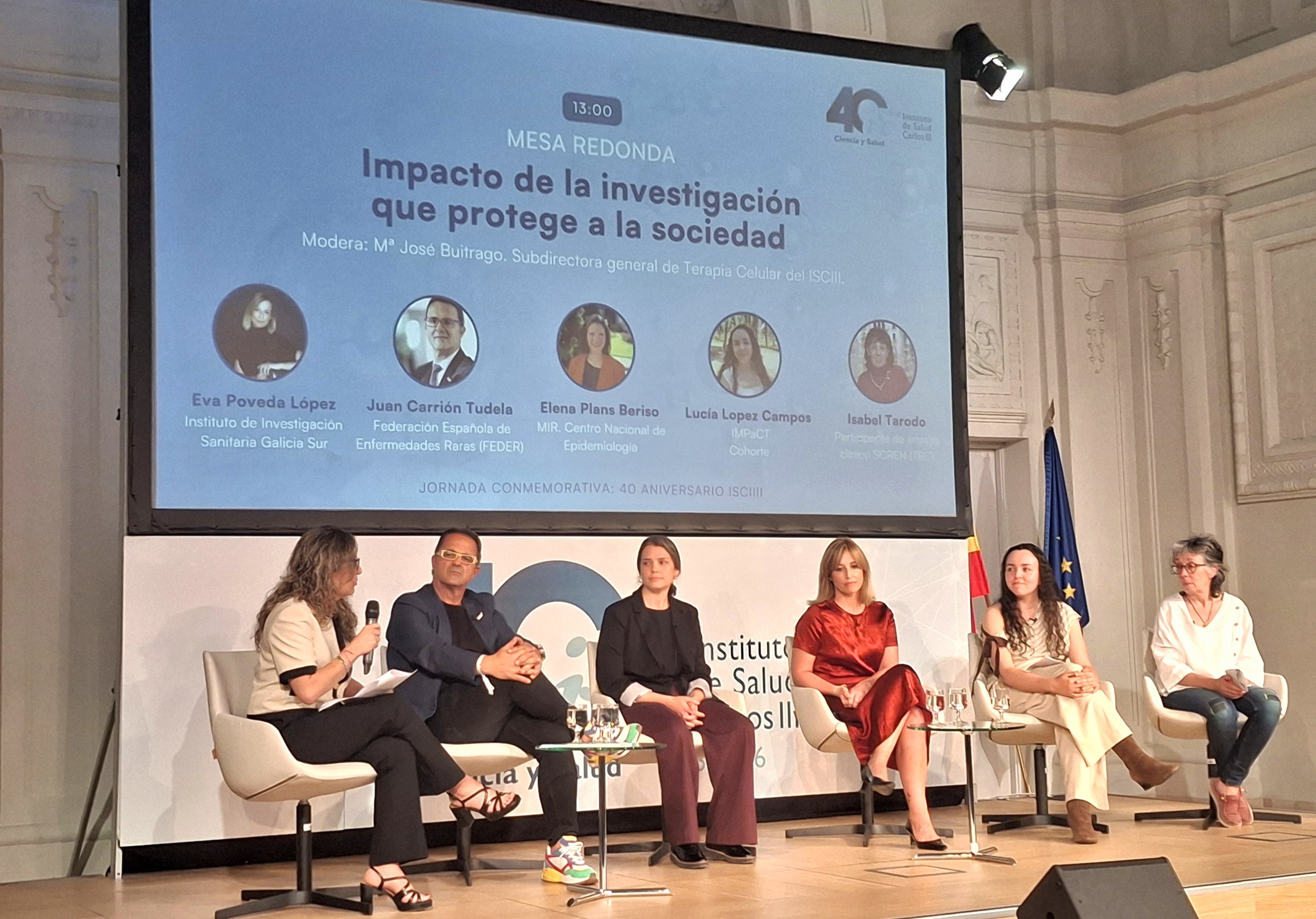 A continuación, una segunda mesa redonda se ha centrado en el ‘Impacto de la investigación que protege a la sociedad’. Ha contado con la moderación de Mª José Buitrago, subdirectora general de Terapia Celular del ISCIII, y con la participación de Eva Poveda, del Instituto de Investigación Sanitaria Galicia Sur; Juan Carrión, de la Federación Española de Enfermedades Raras (FEDER); Elena Plans, MIR en el Centro Nacional de Epidemiología del ISCIII; Lucía López, participante del proyecto IMPaCT Cohorte de medicina de precisión, e Isabel Tarodo, participante en el ensayo clínico CAMINA sobre esclerosis múltiple.