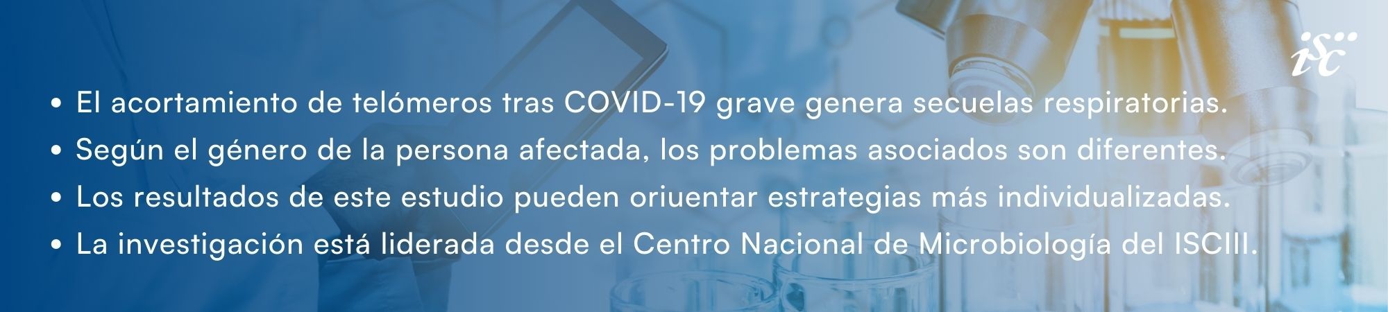 Una nueva investigación liderada desde el Instituto de Salud Carlos III (ISCIII) revela que el acortamiento de los telómeros tras un cuadro grave de COVID-19 se asocia con la aparición de secuelas respiratorias, y que esta asociación es diferente en hombres y mujeres.