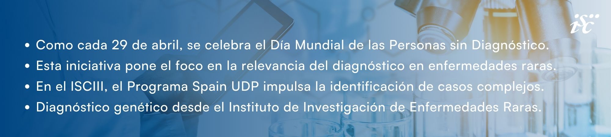 El Día Mundial de las Personas Sin Diagnóstico, que se conmemora cada 29 de abril y que complementa el Día Mundial de las Enfermedades Raras (28 de febrero), es una oportunidad para visibilizar la necesidad de seguir impulsando la investigación para mejorar la identificación de patologías poco comunes difíciles de catalogar. Según explica Eva Bermejo, directora del IIER-ISCIII, "muchas personas afectadas, y sus familiares, esperan en ocasiones años e incluso décadas, hasta que la ciencia puede identificar la enfermedad que explique su condición". Según añade, la ausencia de diagnóstico dificulta el acceso a tratamientos adecuados, empeora la calidad de vida y supone una importante barrera sociosanitaria.